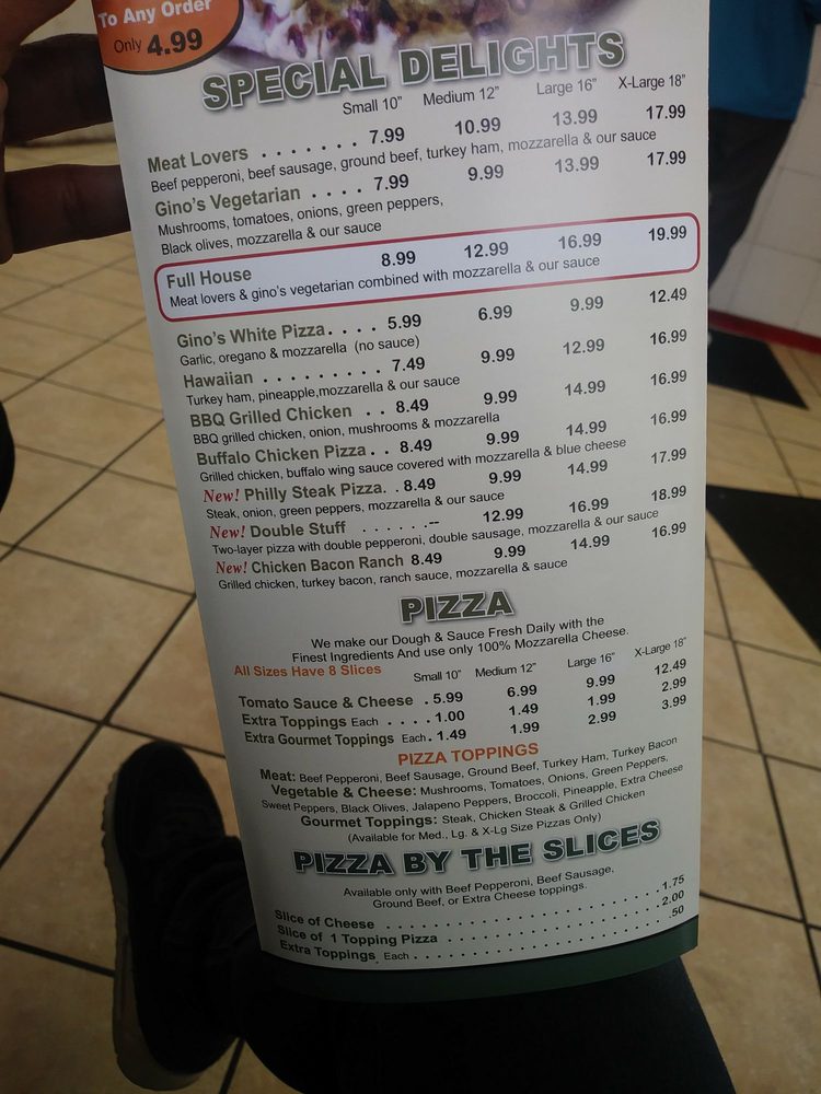 Welcome to Ginos Pizza, your go-to spot for delicious pizza and more in Wilmington, DE. Located at 1402 Lancaster Ave, Ginos offers a menu brimming with mouthwatering options. Their traditional pizzas, especially the all-beef pepperoni, have earned rave reviews for their vibrant flavors and fresh ingredients.